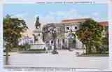 Inscriptions: (v) Statue of Christopher Columbus, Columbus Plaza, Ciudad Trujillo, Dominican Republic. In this pose the Discoverer points the way to new discoveries and symbolizes the era in which Santo Domingo, the historic name of this island, was the capital of the Spanish Empire. In the background is the ancient Cathedral of Santo Domingo in which the Great Admiral is buried.