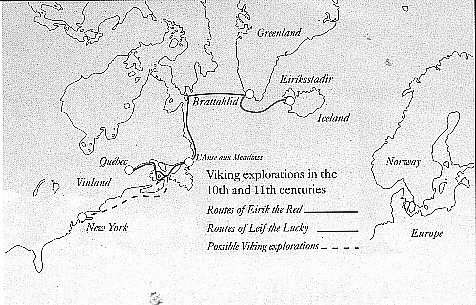 Iceland was a stepping-stone for westward voyagers. Among them were Eiríkur Þorvaldsson (Eirík rauða or Erik the Red), who left his farm Eiríksstaðir near Búðardalur in Dalasýsla, west Iceland, to found the Viking settlement in Greenland. Eiríkur's son Leifur Eiríksson (in English literature more commonly known als Leif Eriksson, or Leif the Lucky), born around 960 A.D., had heard of the accounts of the chance sighting of land to the west of Greenland by the Icelandic trader Bjarni Herjólfsson in 986. In the year 1000 Leifur launched an expedition to explore these coasts. He reached land at a place he named Helluland ("Flatstone Land," namely Baffin Island), then sailed down the coast to Markland ("Wood Land," the south of Labrador). Later he wintered in a place which he named Vínland ("Wineland," Newfoundland or more likely the southern regions of the Gulf of St. Lawrence) after grapes he found growing there. Leifur's brother, Þorvald Eiríksson, made the next voyage to the new-found territory. During a conflict with the Skrælings (the natives) Þorvald was killed. His men buried him in Vinland. Þorvald was the first European we know to die and to be buried in America. A number of other expeditions were made over the next twenty years. An other son of Erik the Red, Þorsteinn Eiríksson, died of a fever on the crossing. His widow Guðríður Þorbjarnardóttir, from Laugarbrekka on the Snæfellsnes peninsula, remarried Þorfinnur Karlsefni Þórðarson (the nickname means, literally, 'Makings of a Man'), son of Þórður Snorrason and Þórunn, and they spent three years in North America. Þorfinnur took 160 people with him and pressed even farther south to explore the New World, reaching a place which he named Hóp and which has been argued to be the site of modern New York.
