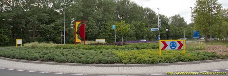 Kunstwerk van 350 x 150 x 10 cm, bestaande uit gezichten in een rood stalen frame met poedercoating. De perspex vormen zijn afwisselend rood en geel aan de voor- en achterzijde.