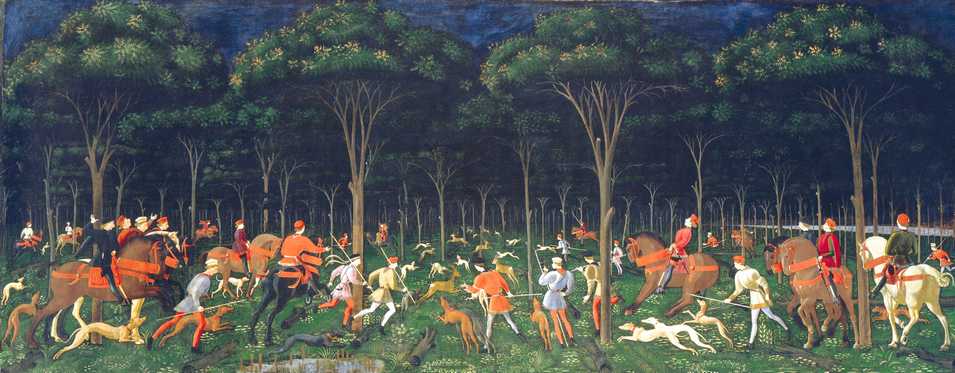 Kunstwerk gemaakt van 52 echte bomen, vier aluminium bomen en acht sindhonden. De kunstenaar heeft zich laten inspireren door het schilderij 'The Hunt in the Forest' (De Jacht in het Bos) van de middeleeuwse Italiaanse schilder Paulo Ucello (1397-1475).
