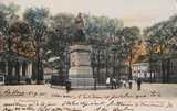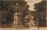 Beeld op natuurstenen voetstuk met op voor- en achterzijde tekst en aan de zijkanten wapenschilden.