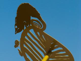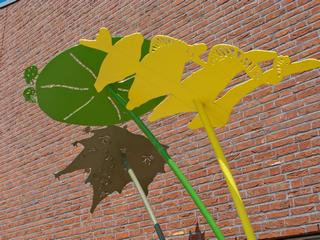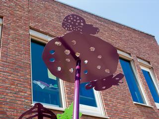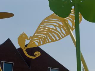 'We hebben de kinderen gevraagd bladeren en beesten uit het oerwoud te tekenen. De mooiste tekeningen hebben we gebruikt om het oerwoud te maken, grote bladeren op hoge stengels. Op de bladeren zitten allerlei verschillende beesten: hagedissen, lieveheersbeestjes, een aapje, maar ook onbekende soorten die nog geen naam hebben. Tussen de bladeren kan je spelen en je verstoppen, of proberen om alle dieren te tellen.'