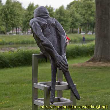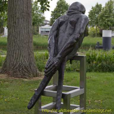 Beeld van een zwaluw met mensenarmen in plaats van vleugels, op een roestvrijstalen stoelachtige stellage.