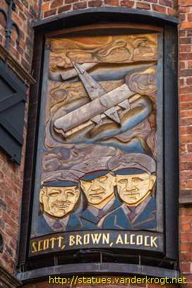 scott, brown, alcock Arthur Whitten Brown (Glasgow 1886 - Swansea 1948) and Capitain John Alcock (Seymour Grove, Old Trafford, 1892 - Cottévrard near Rouen 1919), the crew of the first nonstop flight across the Atlantic in June 1919; Herbert Scott (London 1888 - Beauvais, France 1930), commander of R 34, the first airship to cross the ocean only two weeks later (Wikipedia: Brown, Alcock and Scott). |