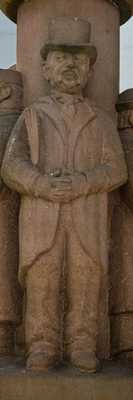Under the feet of the stone figures, the sculptor Willi Hahn has sculpted himself: with the face he looks into the pedestrian zone, his feet protrude in the direction from Brückenstraße out of the column.