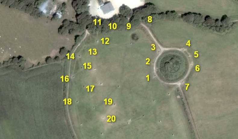 Location of the various statues (situation May 2012 on a Google Earth image of July 2014)