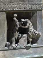 - A statue of a man wearing a toga with on its edge reliefs of documents.