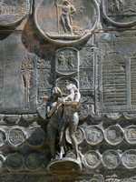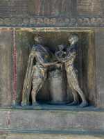 - facing Rue de Belgrade (NE): a portal with two columns and a bronze door. On the bronze door numerous reliefs of various documents.