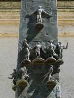Monument recalling an ancient Jewish temple. In front of the 'temple' are four bronze sculptures: