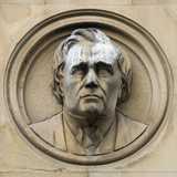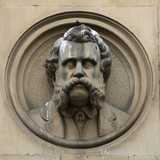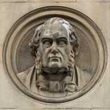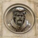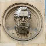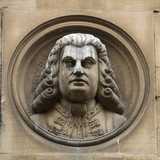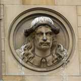 NB. The description of the Wool Exchange in the British Listed Buildings site has a different identification of the portraits. Nr. 6, Lister, is according to that list a portrait of the French weaver and merchant Joseph Marie Jacquard (1752-1834); the five at Bank Street (no. 9-13) are there Raleigh, Drake, Columbus, Cook and Anson respectively. Comparison with other portraits shows that the above identification - taken from the Sculpture trail - is correct. Only the portrait of Columbus shows no resemblance to any of his known portraits.