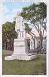 Marble statue of Columbus standing with his proper left leg forward in front of a low wall.