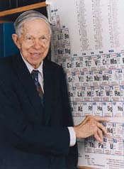 He was involved in the discovery of the elements 93 through 102: these discoveries made the greatest changes in the periodic table since the time of Mendeleyev. From 1961 to 1971 he was head of the Atomic Energy Commission. He was awarded the Nobel Prize for Chemistry with Edwin McMillan in 1951. About the naming, Glenn Seaborg himself wrote in 1994: "I am, needless to say, proud that U.S. chemists recommended that element 106, which is placed under tungsten (74), be called 'seaborgium.' I was looking forward to the day when chemical investigators will refer to such compounds as seaborgous chloride, seaborgic nitrate, and perhaps, sodium seaborgate." (note)and also "This is the greatest honor ever bestowed upon me--even better, I think, than winning the Nobel Prize, Future students of chemistry, in learning about the periodic table, may have reason to ask why the element was named for me, and thereby learn more about my work." (note) Jeffrey Winters wrote in January 1998 in Discover Magazine: "Not only is Seaborg the first living scientist to have an element named after him, he’s also the only person who could receive mail addressed only in elements: Seaborgium, Lawrencium (for the Lawrence Berkeley Laboratory where he still works), Berkelium, Californium, Americium. But don’t forget the zip code." (note)