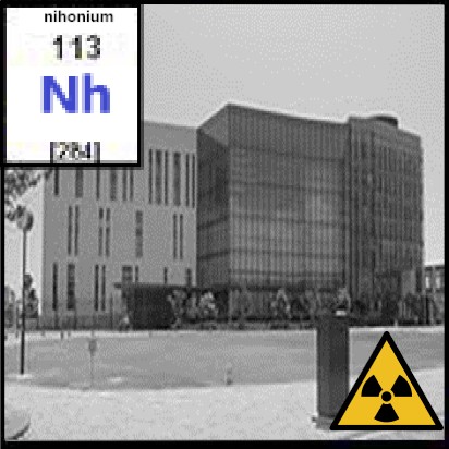 Scientists from the Glenn T. Seaborg Institute and the Chemical Biology and Nuclear Science Division at the Lawrence Livermore National Laboratory, in collaboration with researchers from the Joint Institute for Nuclear Research in Russia (JINR), have discovered the two newest super heavy elements, element 113 and element 115. In experiments conducted at the JINR U400 cyclotron with the Dubna gas-filled separator between July 14 and Aug. 10, 2003, the team of scientists observed atomic decay patterns, or chains, that confirm the existence of element 115 and element 113. In these decay chains, element 113 is produced via the alpha decay of element 115. The results have been accepted for publication in the Feb. 1, 2004 issue of Physical Review C. Kosuke Morita and co-workers at the Cyclotron Center of the RIKEN Discovery Research Institute carried out an experiment on the synthesis of element 113. They published it in October 2004 in the Journal of the Physical Society of Japan. This is the abstract of their article: The convincing candidate event of the isotope of the 113th element, 278113, and its daughter nuclei, 274111 and 270Mt, were observed, for the first time, in the 209Bi + 70Zn reaction at a beam energy of 349.0 MeV with a total dose of 1.7 × 1019. Alpha decay energies and decay times of the candidates, 278113, 274111, and 270Mt, were (11.68 ± 0.04 MeV, 0.344 ms), (11.15 ± 0.07 MeV, 9.26 ms), and (10.03 ± 0.07 MeV, 7.16 ms), respectively. The production cross section of the isotope was deduced to be 55+150-45 fb (10-39 cm2). The element has got the preliminary systematic IUPAC name Ununtrium. The name Nihonium (Nh) was disclosed in 2016 for public review: