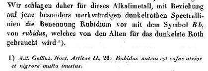 Interesting is the note to Aulus Gellicus, a rather obscure Roman writer from the middle of the second century AD. Only one, incomplete book is left, the Noctes Atticae (Attic Nights). This work takes its name from having been begun during the long nights of a winter which he spent in Attica. In this work he had jotted down everything of unusual interest that he heard in conversation or read in books. Chapter 26 of the second book is about the words for the different colors in Latin and Greek, "Sermones M. Frontonis et Favorini philosophi de generibus colorum vocabulisque eorum Graecis et Latinis; atque inibi color «spadix» cuiusmodi sit"verse 8 is "Non enim haec sunt sola vocabula rufum colorem demonstrantia, quae tu modo dixisti, «russus» et «ruber», sed alia quoque habemus plura, quam quae dicta abs te Graeca sunt: «fulvus» enim et «flavus» et «rubidus» et «poeniceus» et «rutilus» et «luteus» et «spadix» appellationes sunt rufi coloris aut acuentes eum quasi incendentes aut cum colore viridi miscentes aut nigro infuscantes aut virenti sensim albo illuminantes."and 24: "«Rubidus» autem est rufus atrior et nigrore multo inustus, «luteus» contra rufus color est dilutior"(Thanks Dennis for the translations) The preparation of the metal was tried by Bunsen, but he never got samples with more than 18% of Rubidium. The separation of the metal was only accomplished by Hevesy, through the hydrolysis of melted Rubidium hydroxide. Later, Hevesy also obtained Rubidium through the reduction of that hydroxide Sodium,