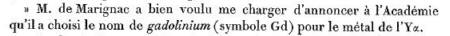 The story of discovery and naming of this element began with Carl Gustav Mosander splitting old yttria into three new earths, yttria proper, erbia, and terbia (see table to the right, and the Rare Earths page). Mosander's erbia was confirmed by Marc Delafontaine in 1878 and renamed terbia, since the name erbia was since 1860 in use for Mosander's Terbium. Delafontaine's terbia was split by Jean de Marignac in 1880 into an earth to which he gave the provisional name Yα and true terbia (note). In 1886 François Lecoq de Boisbaudran produced a more pure form of the earth Yα. He separated it from Mosander's didymia, which originated from the mineral samarskite (cf. Samarium). After a correspondence with Marignac, Lecoq announced the Academie that Marignac had chosen to give Yα the name gadolinia. (note). The reason is not given, but clearly is it named after the mineral gadolinite: