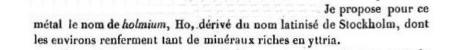 In 1878, Jean Charles Galissard de Marignac, professor of Chemistry at the University of Geneva, separated Berlin's erbia into two new earths, erbia and ytterbia (note). Marignac's erbia was the following year split by Cleve into erbia proper and two new elements, which he named Thulium and Holmium (note). (it seemed that Delafontaine's Philippium, found in 1878 in samarskite, was identical with Holmium).