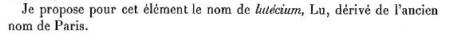In 1860 the Swedish chemist Nils Johan Berlin (1812-1891) denied the existence of Mosander’s erbia, and gave this name to his terbia. In 1878 Marignac split Berlin's terbia in two new earths, terbia proper and ytterbia. Then Marignac's ytterbia, in turn, was split by Nilson in 1879 into scandia and a new ytterbia. Finally, Nilson's ytterbia was separated by Georges Urbain (1872-1938) in 1907 into neoytterbia and lutecia, with the elements Neoytterbium and Lutecium (note). Urbain named the element after Lutetia Parisorum, the Latin name for Paris: