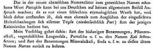 My proposal is: to determine the name Kali instead of the present names vegetable alkali, vegetable lye salt, potash etc.; and to return to its old name Natron instead of the names mineral alkali, soda etc.).
