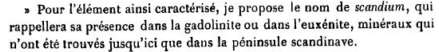 In 1879 he split Marignac's ytterbia (see the special Rare Earths page) into two new earth, pure ytterbia and a new element that he found matched Mendeleyev's ekaboron. In 1879/80 he published his findings (note). Nilson explained the naming of the element thus: "For the element thus characterized I propose the name «scandium», which will bring to mind its presence in gadolinite or euxenite, minerals that have so far been found only in the Scandinavian Peninsula."