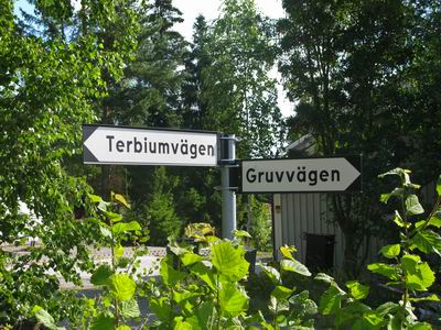 Terbium Road and Quarry Road in Ytterby, Summer 2009.