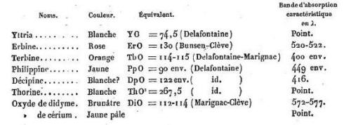 Mosander's original erbia was confirmed by Marc Delafontaine in 1878 and, renamed terbia, since the name erbia was already common for Mosander's terbia. Delafontaine illustrates his article with the following table, which should bring some clearness in the complicated matter of the rare earths (note):