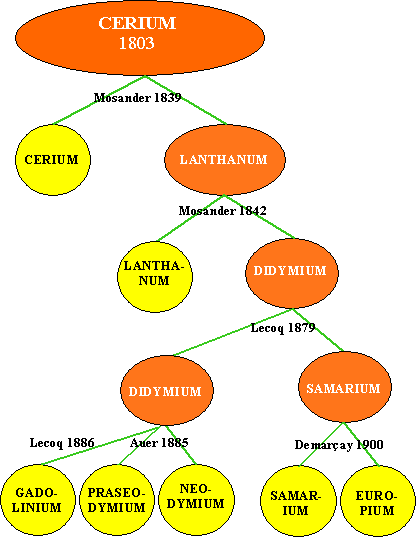 Elements discovered in ceria (Click on the yellow circles for the element pages).