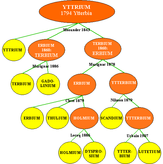 Elements discovered in yttria (Click on the yellow circles for the element pages).