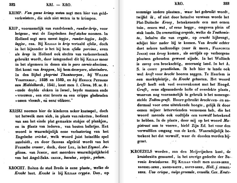 | Woordenboek der Nederlandsche Taal 8ste dl., 1916: KROCHT -KROFT- Znw. m., vr. en onz., mv. -en. Nnl. crocht(e), croft(e); ags croft, meng. crofft, neng croft. Van onbekenden oorsprong. 1) Een hooge zandgrond, of een op hooge zandgrond aangelegde akker, in 't bijzonder toegepast op akkers in de duinen. Soms als eigennaam; zie b.v. BOEKENOGEN 521 / Hoede ghy alleen den Schapen op eenighen crocht? COORNHERT, Odyss. 1,42. Deen maeckte crochten, dander thuynen en hecken, VALCOOGH, Chron. v.d. Sype 53. Al 't vlak om ... Leeuwaarde, Franeker, Dokkom, Bolswaaert lagh meest ooverstroomt; en weeigh kroften, die uitkeeken, HOOFT, N.H. 217. Ten Zuyden lagh de Wey; op 't Noorderlick verand'ren Van Wey in drooge kroft, daer deelde 't spoor het scheel, HUYGENS 1,32. Een Bron van Levens vocht Brengt Hy uyt droge krocht En uyt een dorr' woestijn, v. LODENSTEYN, Uytsp. 1,51. Holland ..., Waar 't voorgeslacht uit wier en krocht Een paradijs van wondren wrocht, SPANDAW 4, 201 (ed. 1857). 2) Een tusschenveld, een nog niet uitgegraven stuk land te midden van veenderijen. // Veenen, waar ... het weinige vee op krochten of tusschen velden graast, die nog niet ingestoken zijn, waarop vrij goed hooi groeit, BERKHEY, NH. 9,10. Aanm. Niet altijd is met zekerheid te zeggen, in welken zin krocht bedoeld is: zie BOEKENOGEN 520; verg. ook ANTONIDES 1, 136; 3, 39; HUIZINGA BAKKER, Poëzy 1,89; BERKHEY, N.H. 1,75; dez. Eerb. Proefk. 245. Bij de genoemde dichters is 't stellig als synoniem van land, veld, streek gebruikt, zonder dat er een nauwkeurigen beteekenis aan gehecht wordt. Samenst. Krochtland ("Een perceel Wei- of Hooiland, zijnde Krochtland, ... gelegen ... in het Oosteinde der gemeente Voorburg", Haarl. Cour. v. 24 Sept. 1857, bl. 2). - Als tweede lid. Korenkrocht ("De Koorn-Krochten, diens Halmen ... vry hoogh stonden", Holl. Merc. 1672, 68); teelkrocht. |
