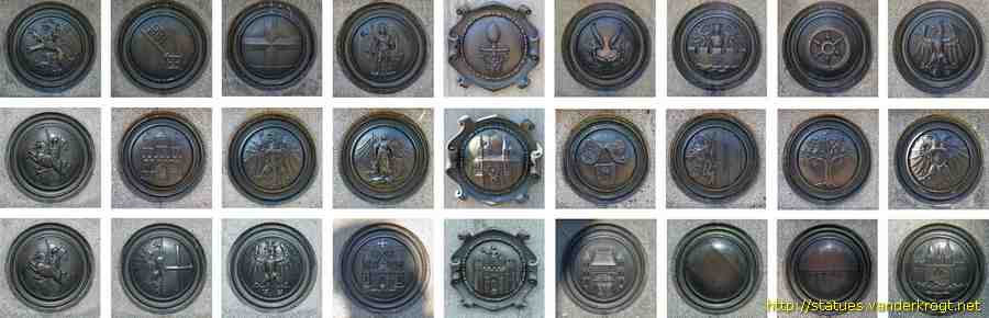On the balustrades of the sides are 27 coats of arms of towns that played an important role in the Reformation, placed in alphabetical order: