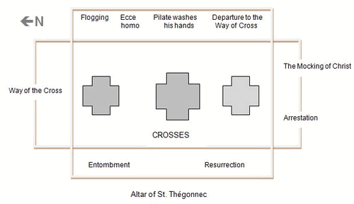 The calvaire in Bretagne is distinguished from a simple crucifix cross by the inclusion of three-dimensional figures surrounding the Crucifixion itself, typically representing Mary and the apostles of Jesus, though later saints and symbolic figures may also be depicted.