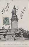 On a 15 meter/50 feet high base stands a 7½ meter/25 feet tall allegorical woman (Marianne) representing the Republic. She wears a Phrygian cap and caresses a lion's head with her right hand and holds an olive branch (symbol of peace) with her left hand. At the top of the base is a frieze with reliefs of the symbols of the republic: the Gallic rooster trampling a snake, a double cornucopia with the Phrygian cap, and a double cornucopia with the symbol of the city of Lyon (?). Below this frieze are the dates 1848 - 1870.