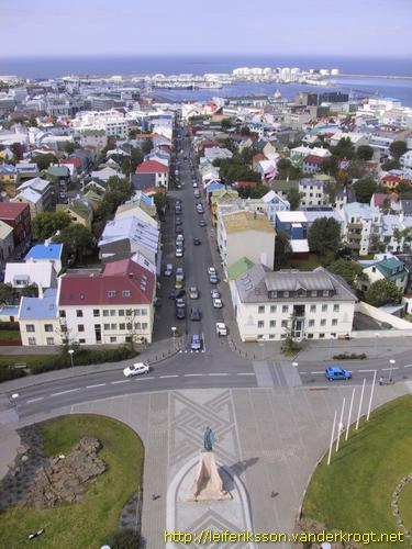 View from the tower of the Hallgrímskirkja. The statue of Leif Eriksson is at the bottom. The street from the church to the west is the Skólavörðustígur. Leif is looking through this street to the west, to the Ocean and Greenland.