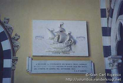 On the marble plate the text: "A ricordare la costruzione dei modelli delle caravelle di Cristoforo Colombo eseguita in queste sale per invito del Comune di Genova nel settembre 1892". (in commemoration of the construction of the models of caravels of Cristopherr Columbus executed here on instigation of the Town of Genoa in September 1892). The models are at present near the Maritime Museum.
