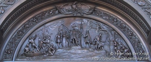 This panel depicts the Spaniards taking possession by erecting a cross on the island of Hispaniola. One of the sailors is carrying an Indian girl he has taken prisoner on his shoulders, as Columbus shows his disapproval. The panel is flanked by statuettes of Pope Alexander VI, who supported Spain's claim to the new land, and explorer Francisco Pizarro.
