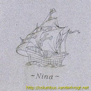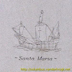 In the center of a circular brick planter stands a wide obelisk adorned with bronze inscription plaques and incised with images of Columbus' three ships, the Nina, Pinta, and Santa Maria. The planter is surrounded by a wrought iron fence.